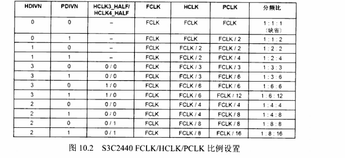 对于S3C2410、S3C2440这个寄存器表现稍有不同CLKDIVN 位 说明 HDIVN1 2 0表示保留,1表示FCLK:HCLK:PCLK=1:4:4,此时HDIVN、PDIVN必须设为0b00 HDIVN 1 HCLK的分频系数,0-HCLK=FCLK,1-HCLK=FCLK/2 PDIVN 0 PCLK的分频系数,0-PCLK=HCLK,1-PCLK=HCLK/2