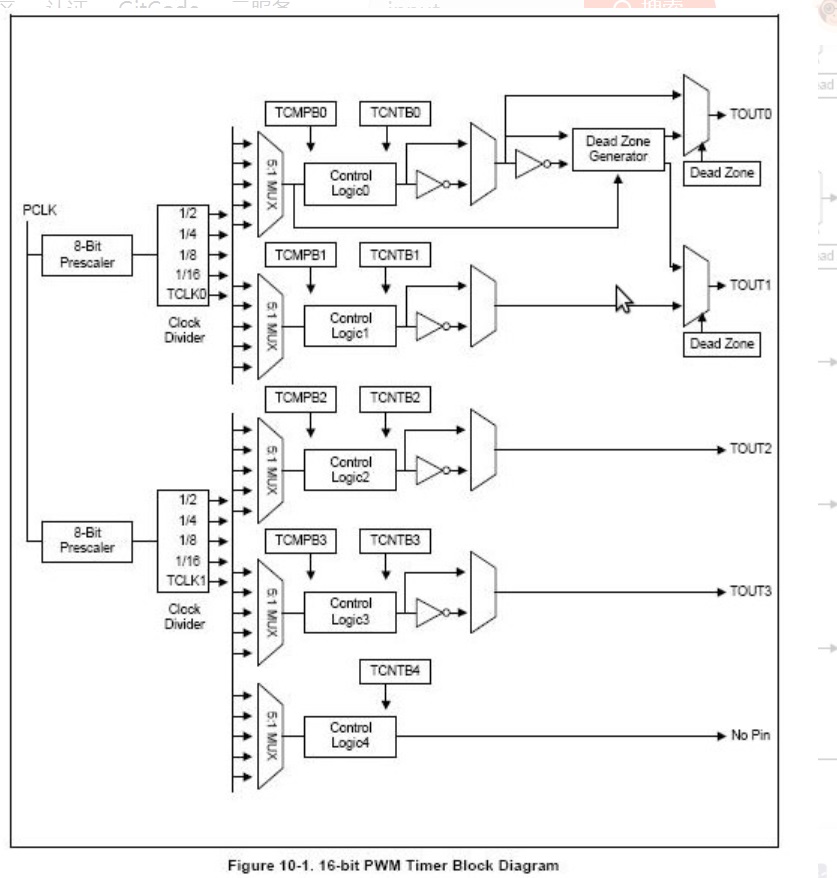 定时器n的输出管脚TOUTn初始状态为高电平,以后在TCNTn的值等于TCMPn的值、TCNTn的值时反转。也可以通过TCON寄存器设置其初始电平,这样TOUTn的输出就完全反相了。通过设置TCMPBn、TCNTBn的值可以设置管脚TOUTn输出信号的占空比,这就是所谓的可调制脉冲(PWM),所以这些定时器就可以称为PWM定时器。