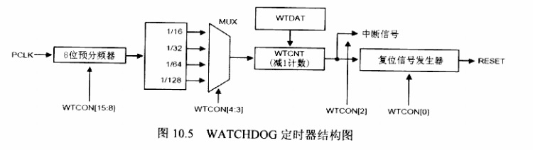 WATCHDOG定时器可以像一般16位定时器一样用于产生周期性的中断,也可以用于发出复位信号以重启失常的系统。它与PWM定时器结构类似。